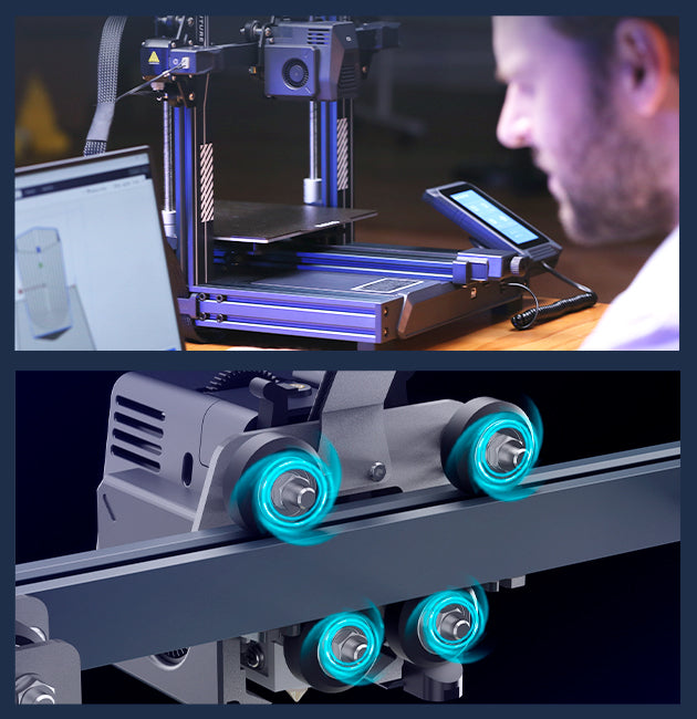 Die verschleißarmen POM-V-Slot-Rollen bewegen sich geräuscharm, geschmeidig und präzise. Das Marken-Netzteil wurde mehrfach geprüft, um sicheres Drucken zu gewährleisten und Druckfehler zu minimieren.