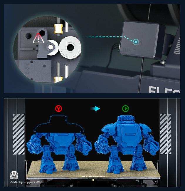 Dank des Filamenterkennungssensors hält der Drucker an, wenn das Filament ausgeht oder reißt. Er schlägt Alarm, bis Sie neues Filament einlegen. So vermeiden Sie Materialverschwendung und Modellverschrottung.