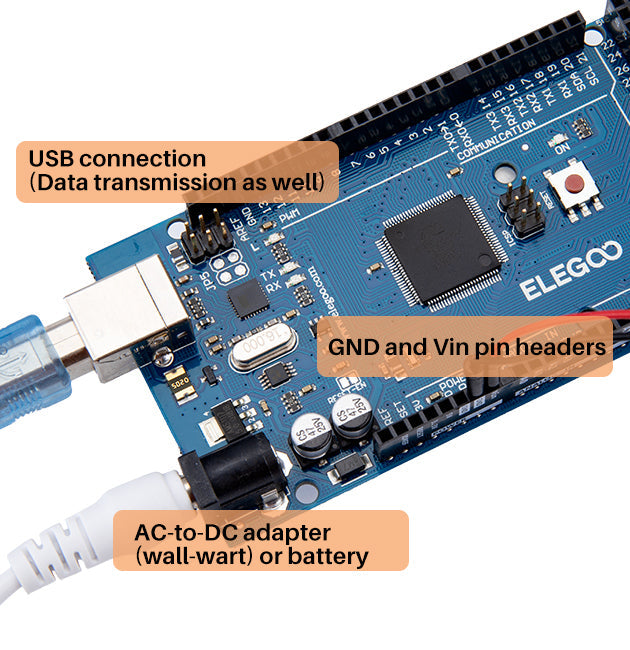 The Elegoo Mega 2560 R3 can be powered via the USB connection or with an external power supply. The power source is selected automatically.