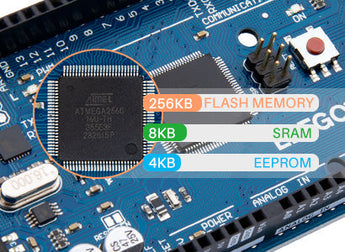 The ATmega2560 of Elegoo Mega 2560 R3 Controller Board has 256 KB of flash memory for storing code (of which 8 KB is used for the bootloader), 8 KB of Spram, and 4 KB of EEPROM (which can be read and written with the EEPROM library).
