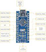 The Elegoo Nano Board is a small, complete, and breadboard-friendly board based on the ATmega328P and it works with a mini USB cable.