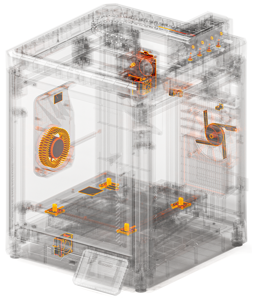 Drucke schneller als je zuvor mit unserem CoreXY System. Zwei 4260-Schrittmotoren treiben unabhängig voneinander die X- und Y-Achse an, während reibungsarme Linearführungen aus Metall für einen reibungslosen, schnellen und präzisen Druckvorgang sorgen.