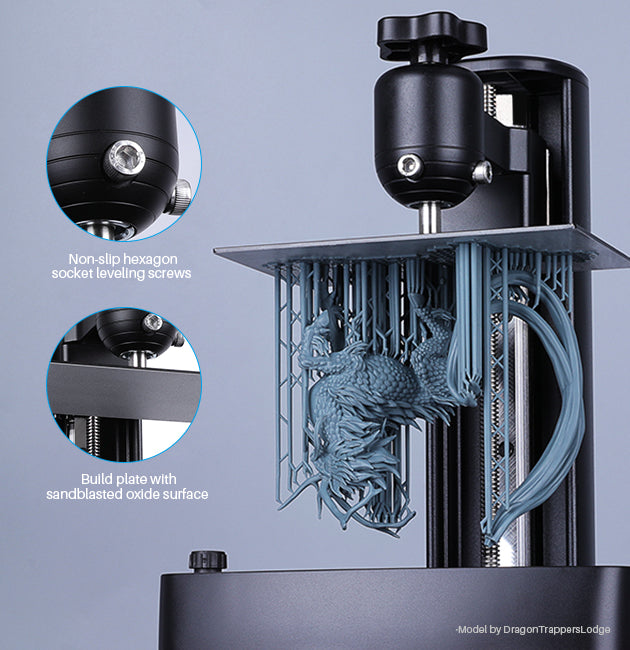 Sandgestrahlte Bauplatte mit rutschsicheren Innensechskantschrauben ermöglicht eine schnellere und einfachere Nivellierung und bietet höhere Stabilität beim Druck großer Modelle oder mehrerer kleiner Bauteile in einem einzigen Durchgang – bei einem großzügigen Bauvolumen von 143,43 × 89,6 × 175 mm³ / 5,647 × 3,52 × 6,8 in³.