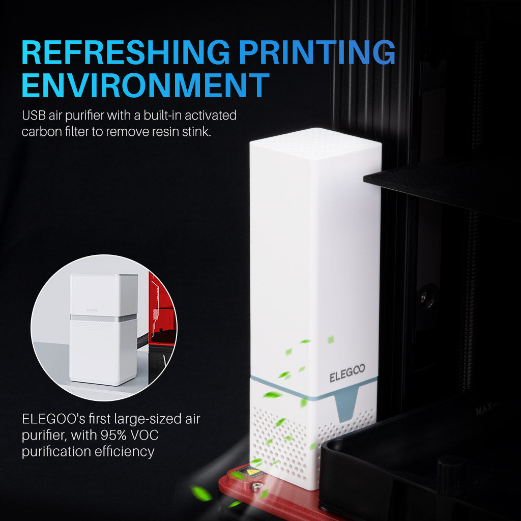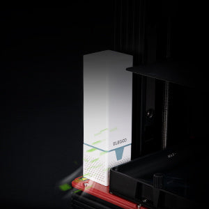 Der Luftreiniger wird per USB angeschlossen und enthält einen Aktivkohlefilter, der den Harzgeruch im Druckraum reduziert. Alternativ können Sie auch den kommenden ersten großen Luftreiniger von ELEGOO wählen, der Formaldehyd und bis zu 95 % der flüchtigen organischen Verbindungen (VOCs) beseitigt.