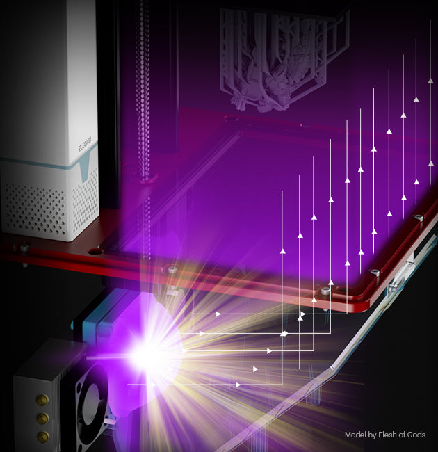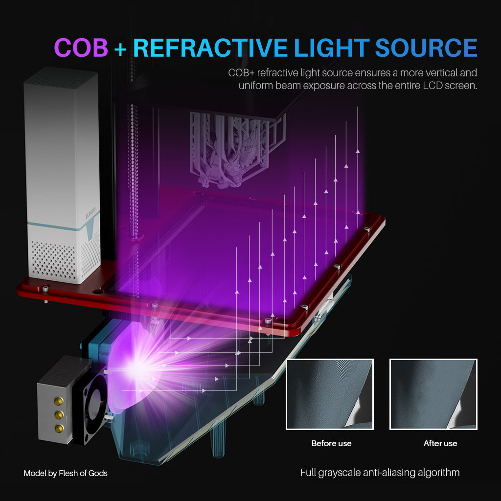 Die refraktive Lichtquelle COB+ sorgt dafür, dass die Belichtung des 405-nm-Wellenlängenstrahls über den LCD-Bildschirm gleichmäßiger und vertikaler mit gleichbleibender Genauigkeit erfolgt.