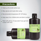 • Storage and Precaution: Keep your resin away from direct sunlight, dust, and out of children's reach. Although it's much safer compared with other 3D printer resin, we suggest you wear a mask and gloves each time when dealing with resin and if you get skin contact please wash with lots of soap water ASAP.