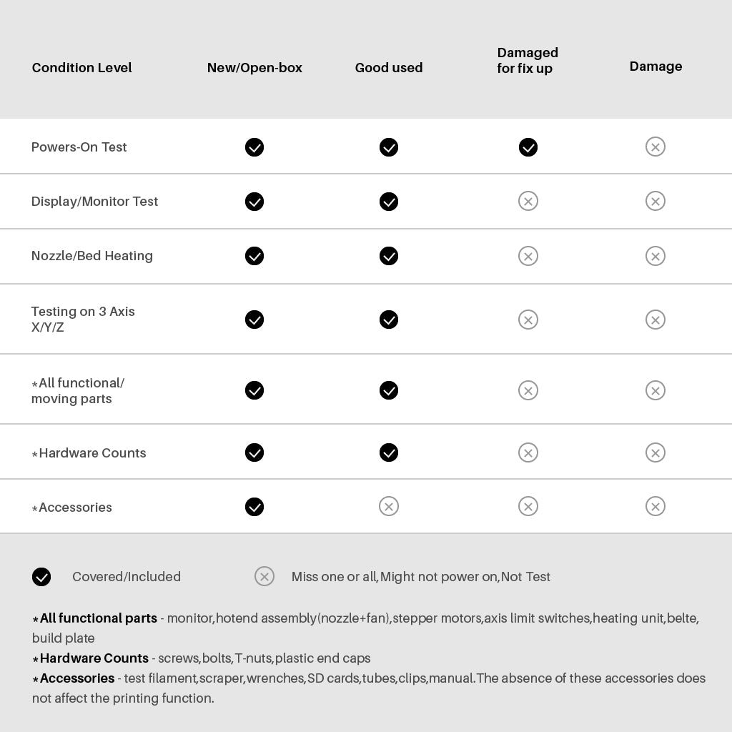 ● Der Wert fehlender Artikel – z. B. Zubehör, Kabel oder Filamente – wird vom Erstattungsbetrag abgezogen.