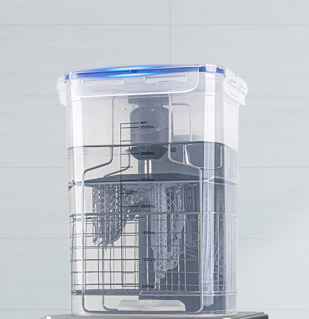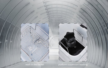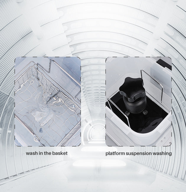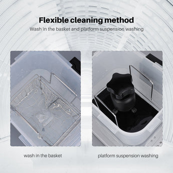 Nachdem Sie das gedruckte Modell von der Druckplattform entfernt haben, legen Sie es in den Reinigungskorb (maximale Modellhöhe: 160 mm) und hängen diesen an der Spitze des Pfostens auf, um mit dem Reinigen zu beginnen. Diese Reinigungsmethode kann für Modelle mit einer Größe von über 15 mm verwendet werden. Einige kleinere Modelle können zusammen in einem Behälter gereinigt werden.
